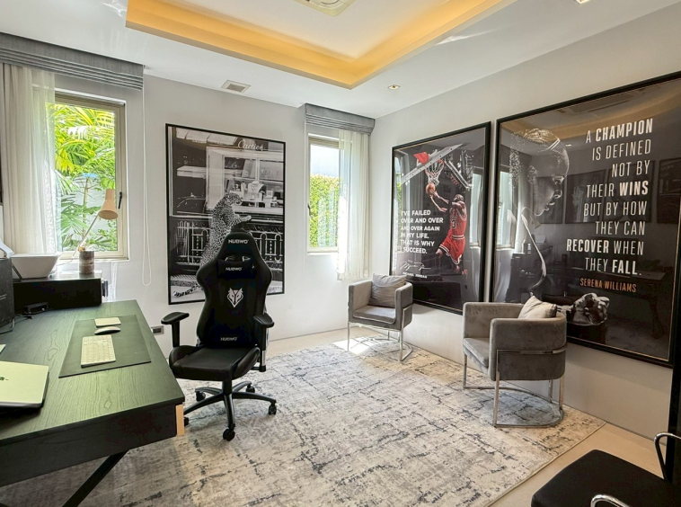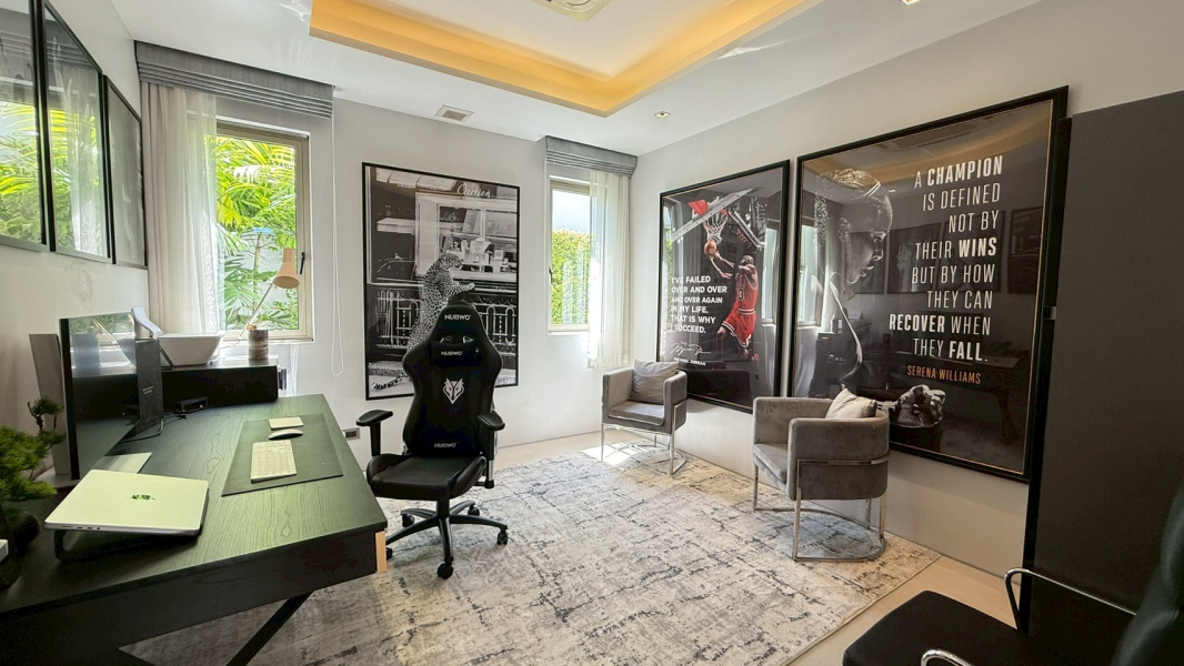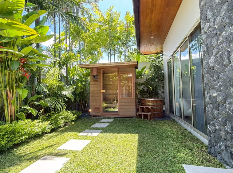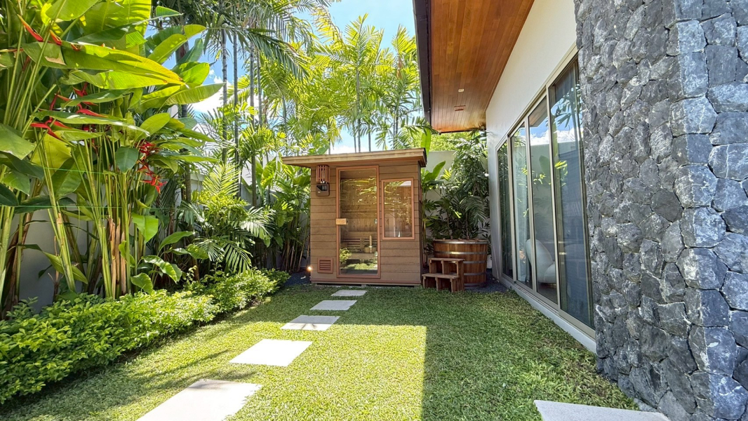 The layout offers seamless transitions between the lush garden, saltwater pool, and sophisticated interiors. Entertain outdoors with a BBQ zone, tranquil sala, and an ice bath beside the teak-wood sauna. Inside, enjoy fully furnished spaces, a built-in wine cellar, and high ceilings flooded with natural light.