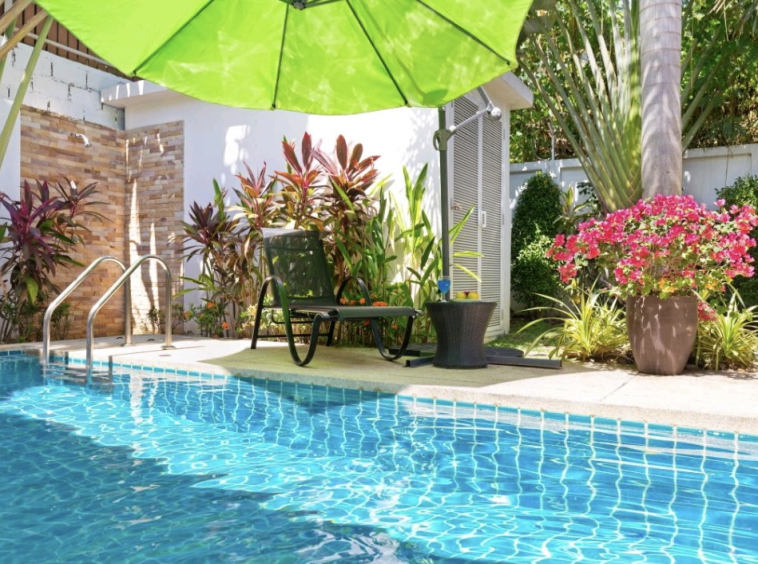 • Private 6 × 3 m swimming pool bordered by a teak deck, two loungers, and an alfresco dining nook