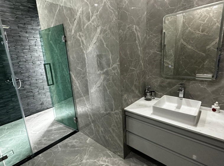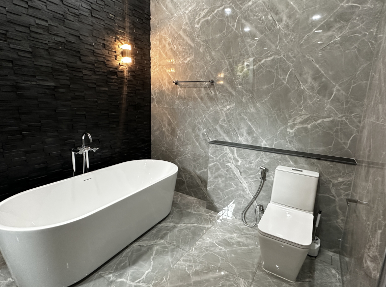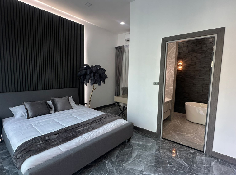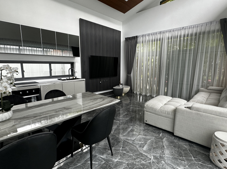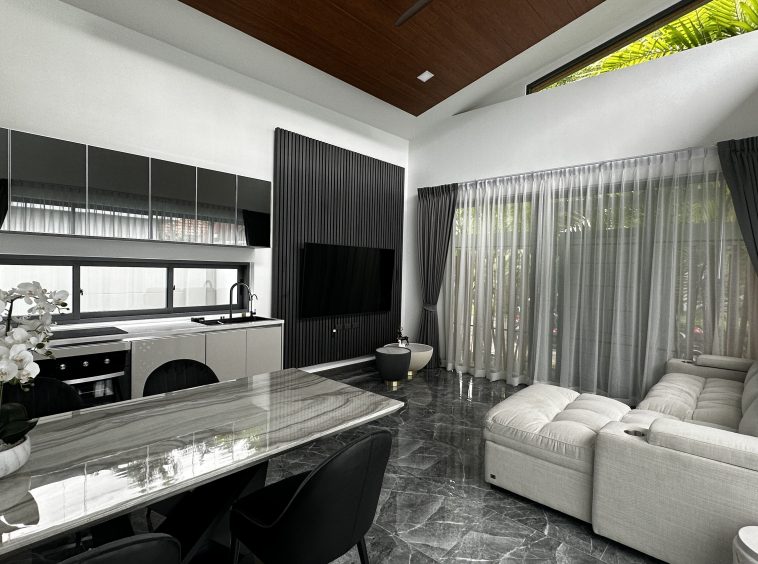 Completed in June 2023, this semi-detached villa is fully furnished with tasteful contemporary decor and premium finishes that give it a clean, natural charm. The spacious living room features soaring 4.5-meter ceilings, allowing plenty of natural light and airflow.