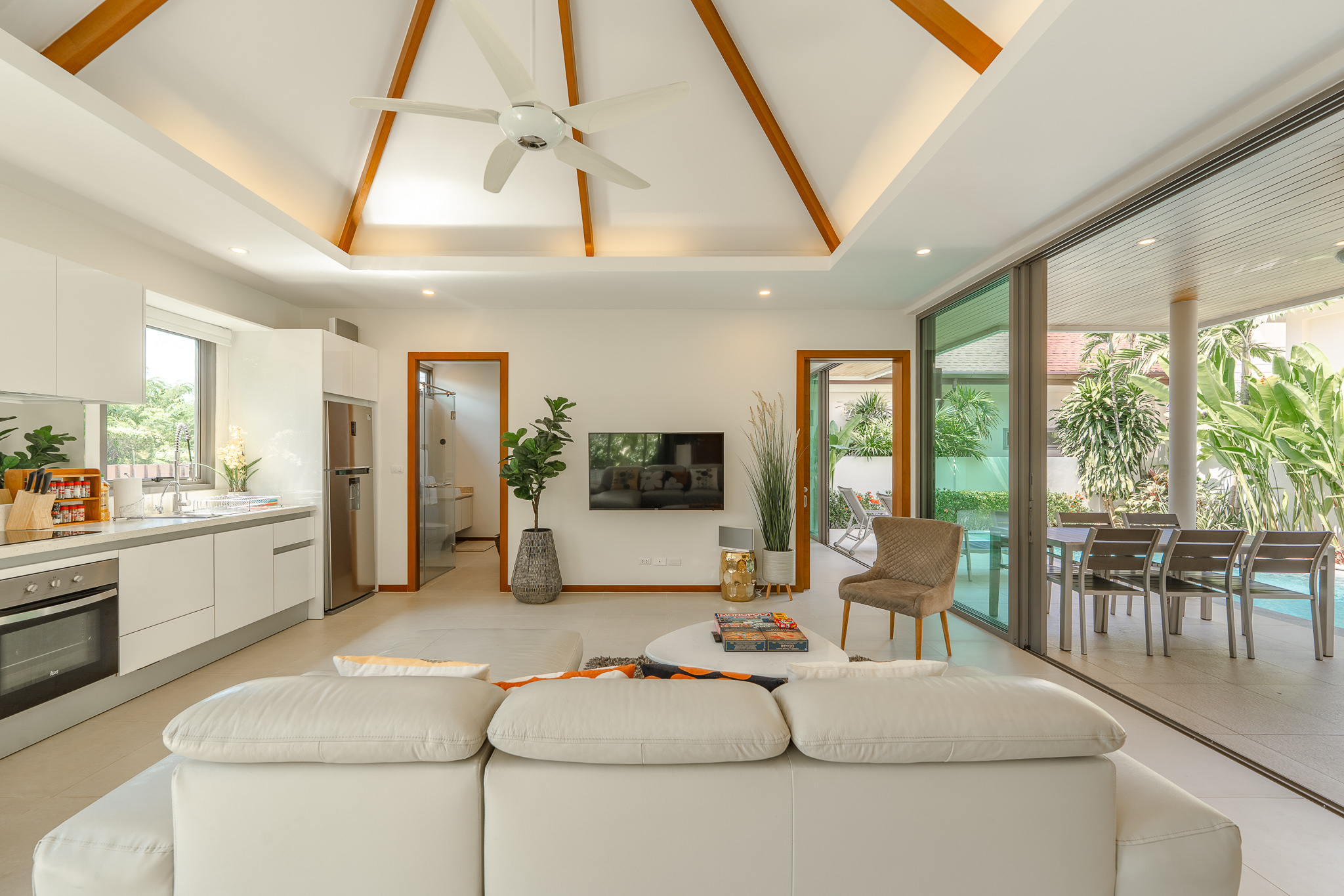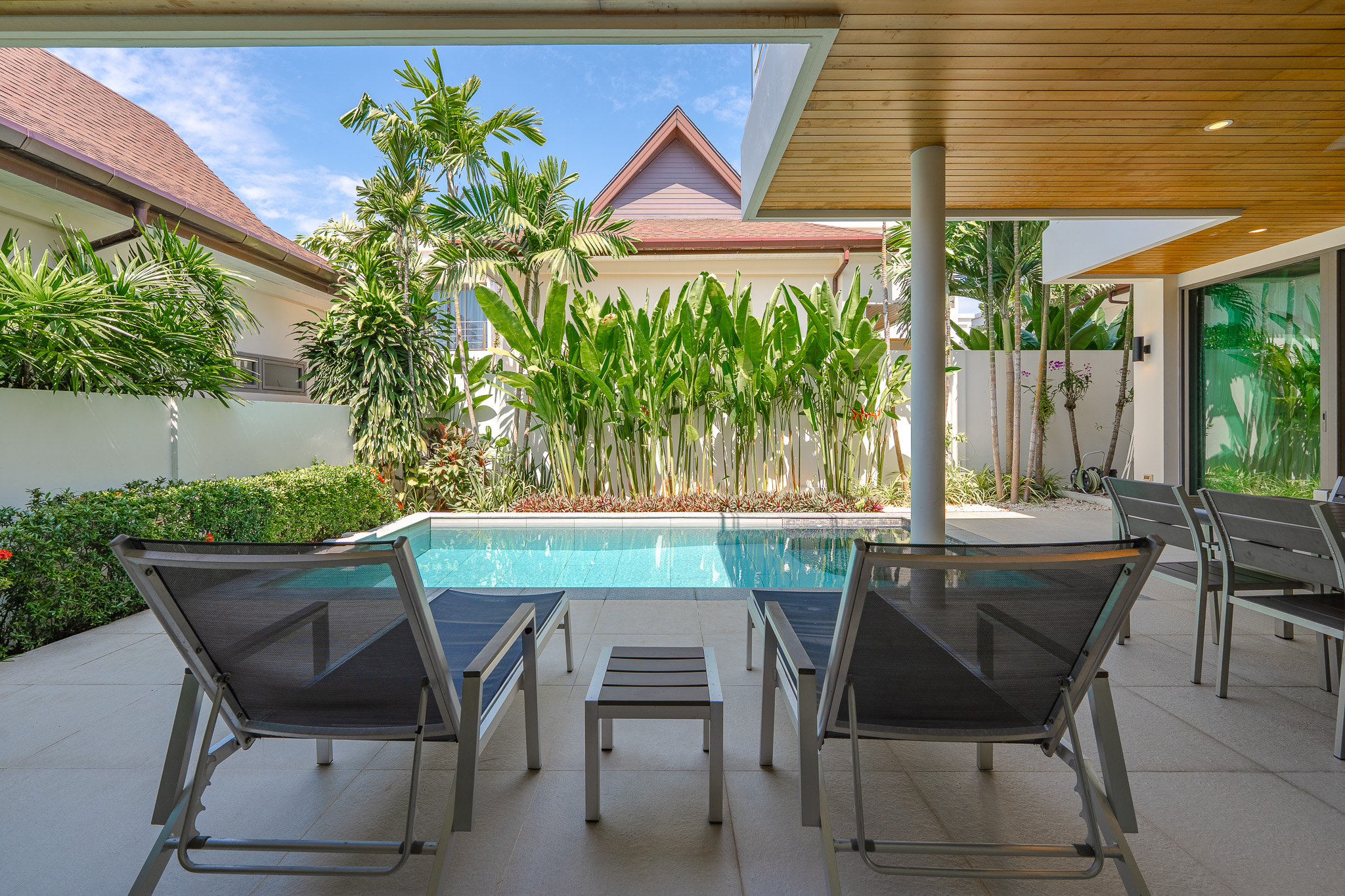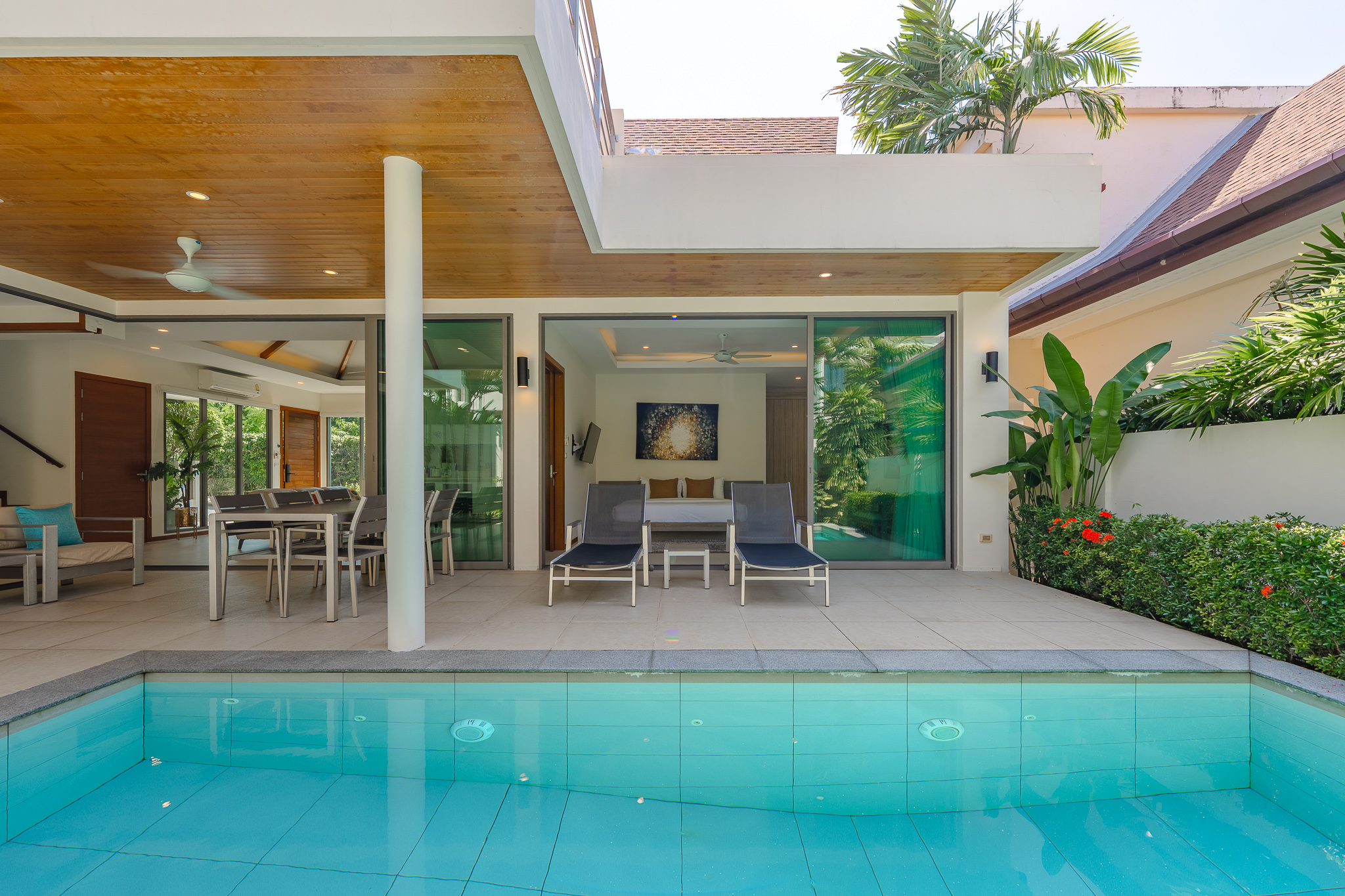 The villa features 4 bedrooms and 4 bathrooms across 241.15 sq.m of thoughtfully designed living space. Large full-length windows draw in natural light and fresh air, enhancing the sense of openness throughout the home. The interiors are practical yet elegant, with generous living and dining areas that connect smoothly to the outdoor terrace and pool area. This is a property suited for comfortable family living, a holiday home, or a smart investment in the Phuket property market.