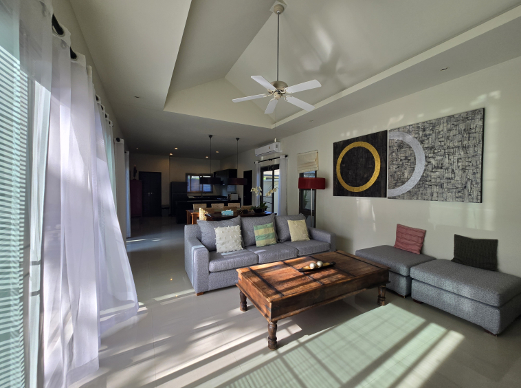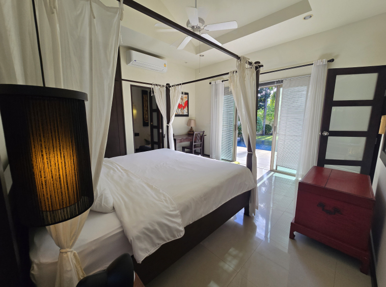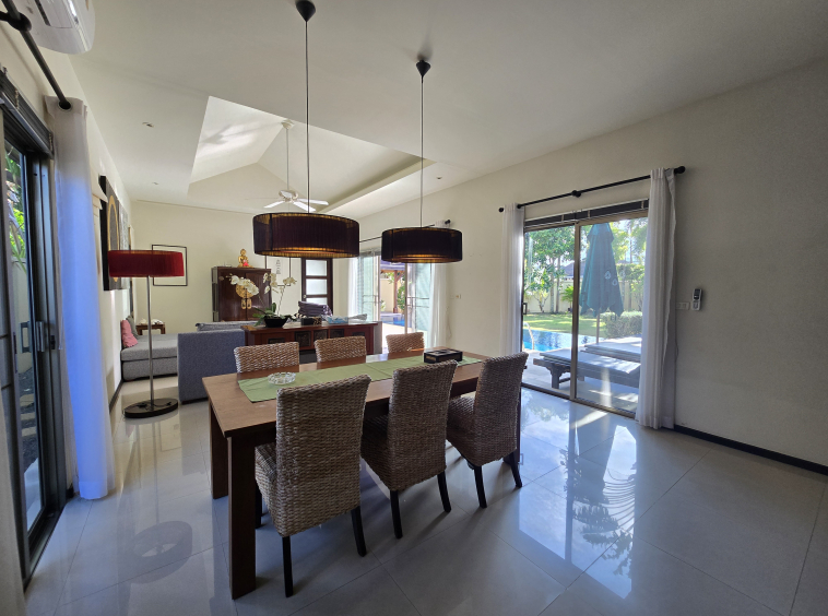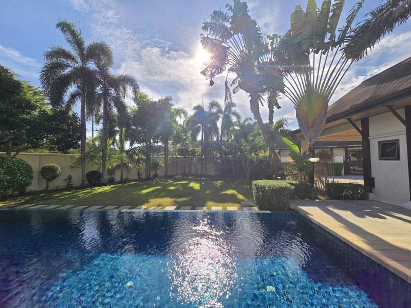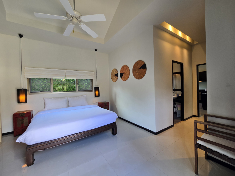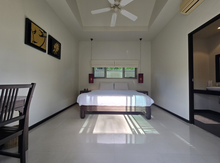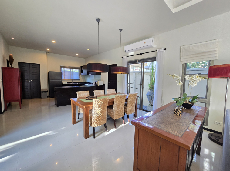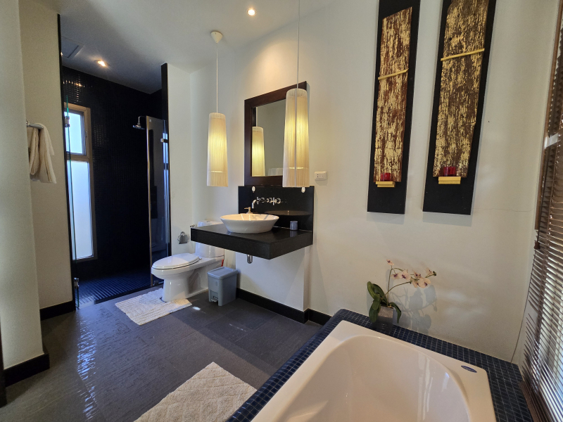 Every inch of this magnificent villa exudes elegance, from its high-ceiling living room to its fully furnished contemporary Thai interiors. The property boasts three spacious bedrooms, each with its own en-suite bathroom, perfectly accommodating comfort and privacy. A private swimming pool, set in a tropical garden, serves as a centerpiece for gatherings and relaxation.