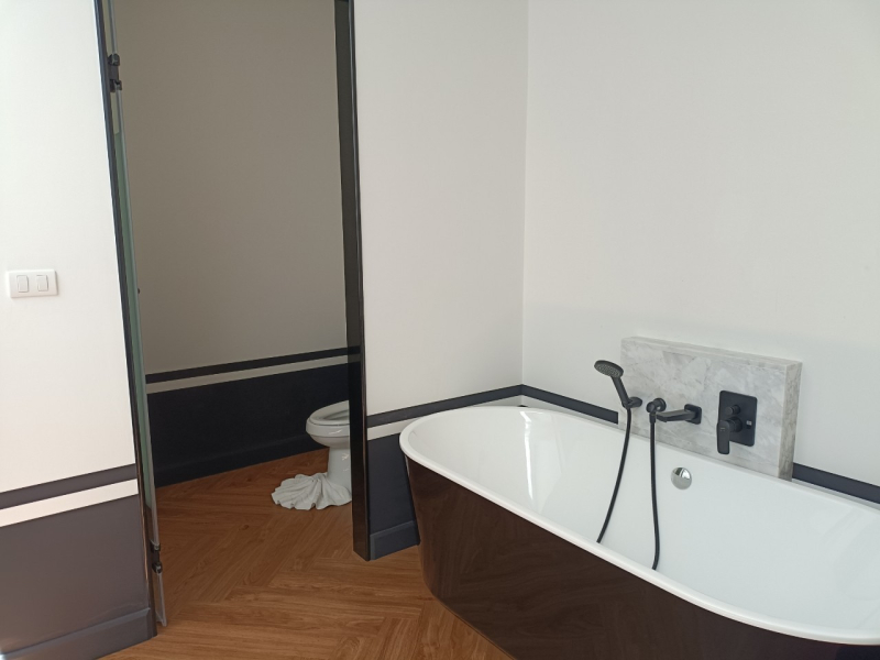 This spacious three-bedroom, three-bathroom villa spans across three floors, delivering a chic living experience. The villa boasts an open living and dining area complete with a built-in kitchen, and a master bedroom equipped with an en-suite featuring both a bathtub and a separate shower area. Its impeccable design extends to a large plot, emphasizing tranquility and style.