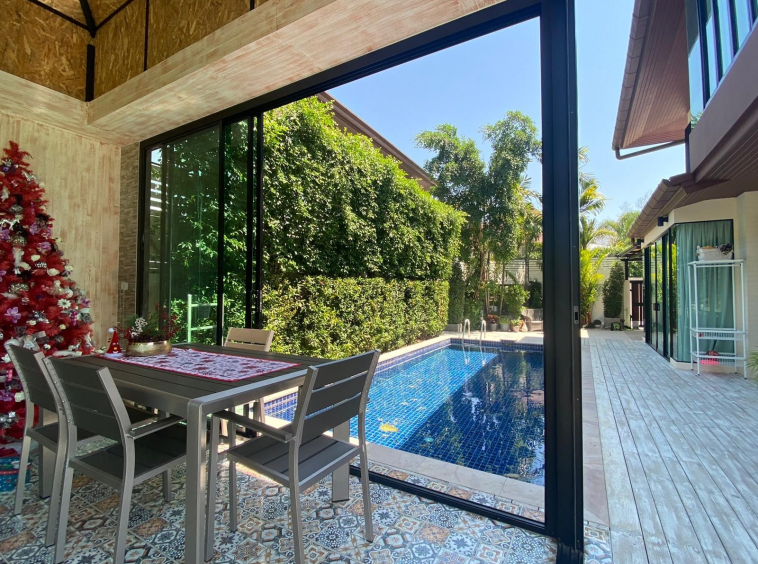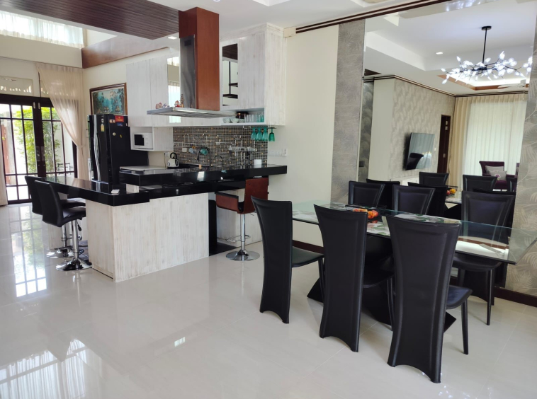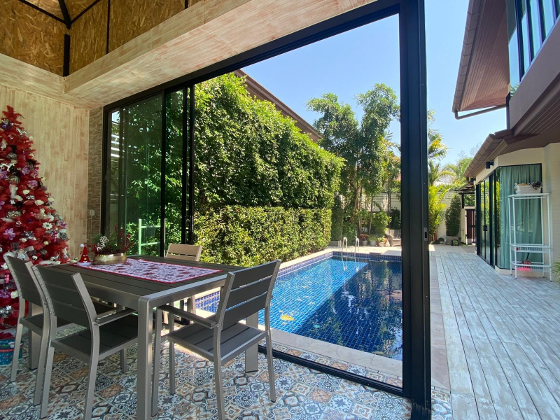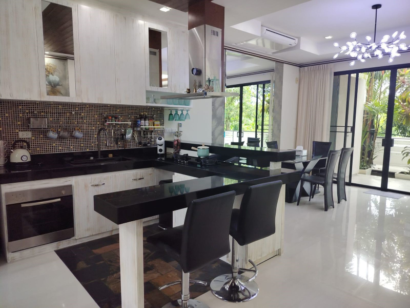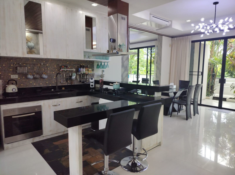 The heart of the home is a fully equipped Western kitchen with everything from a gas stove and oven to a water purifier and dishwasher—making meal prep easy and enjoyable. The open-plan living area flows seamlessly to the outdoors, where an 8×4 meter private swimming pool invites you to relax and unwind in the Phuket sun.