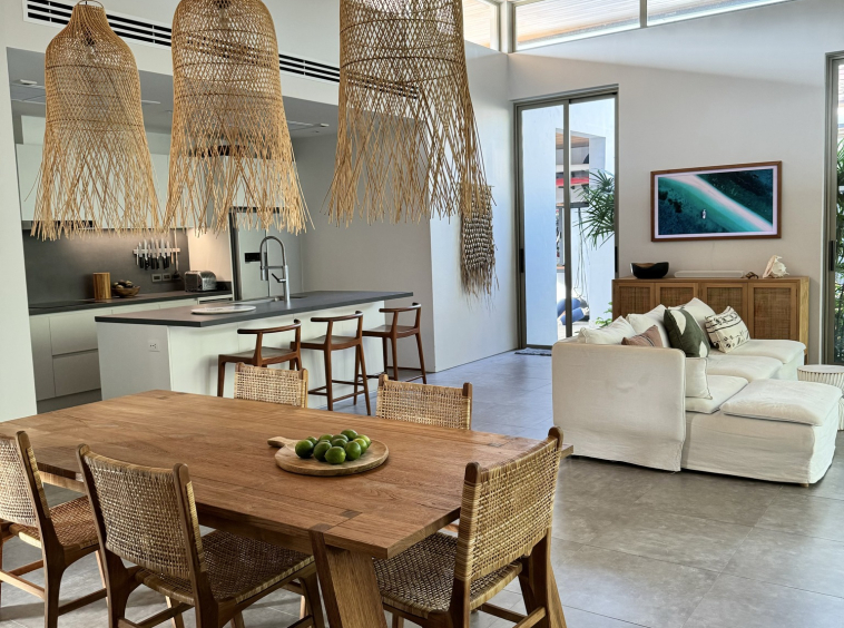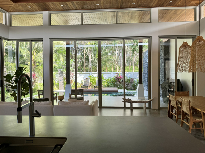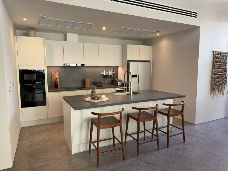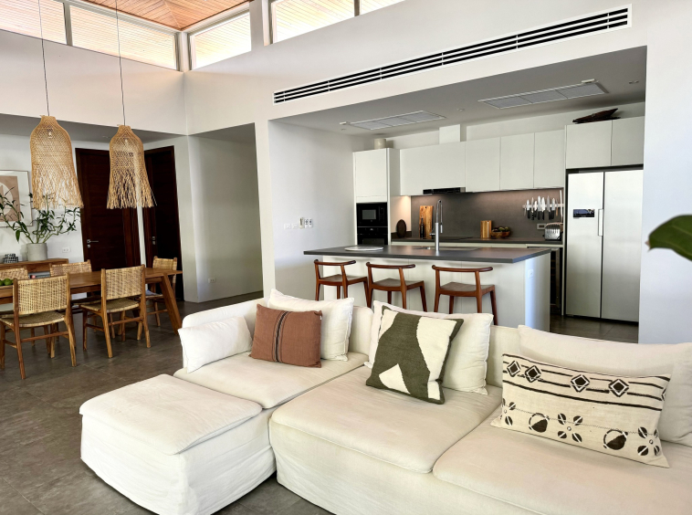 The villa features custom interior décor and a fully equipped high-end kitchen fitted with premium European appliances, ideal for both casual meals and gourmet cooking. All three bedrooms are generously sized and tastefully furnished, offering direct access to the pool or garden.