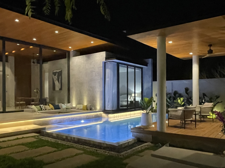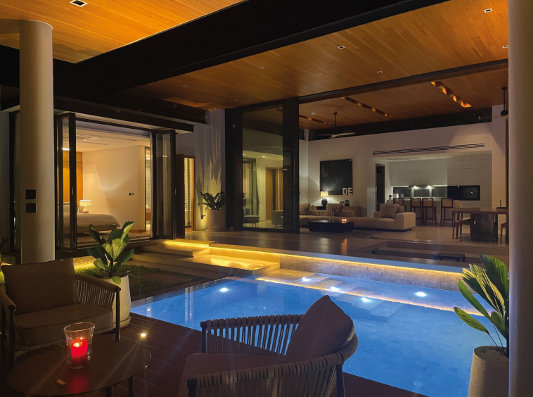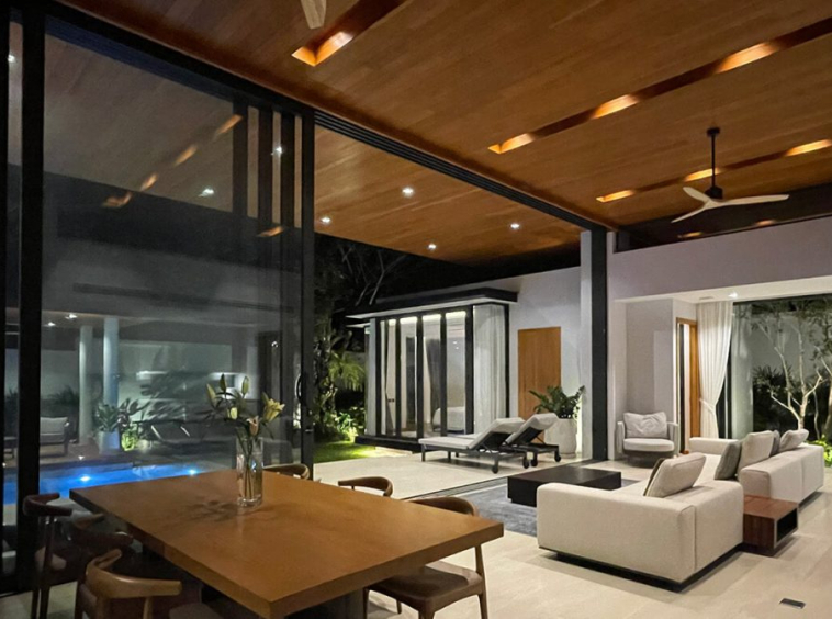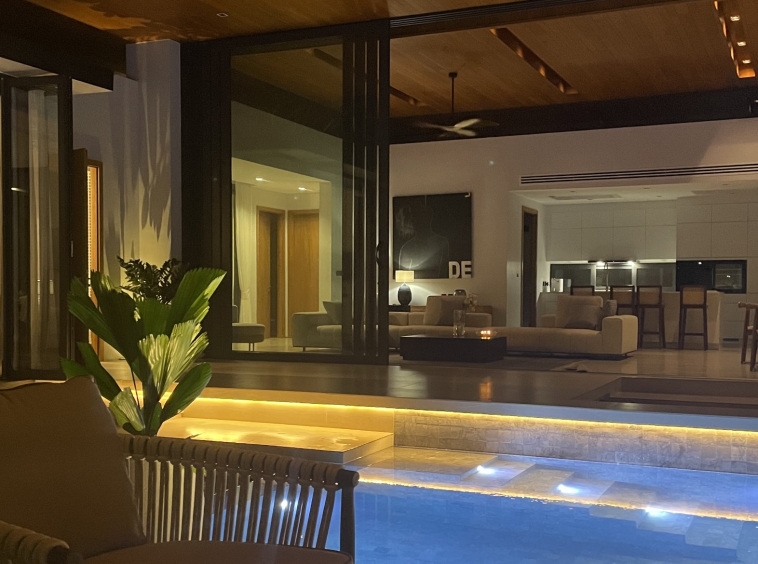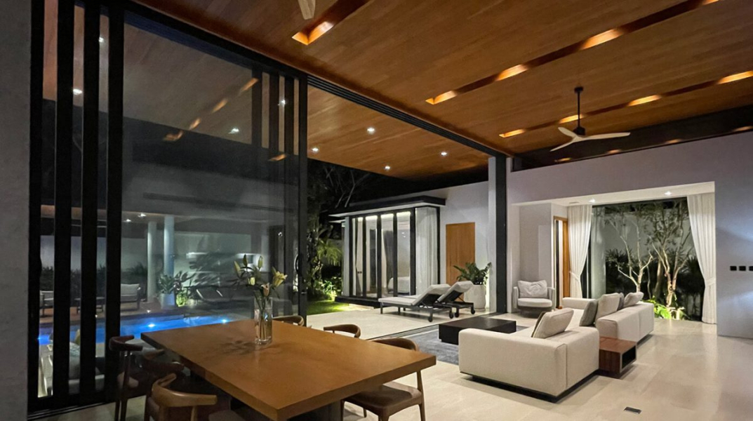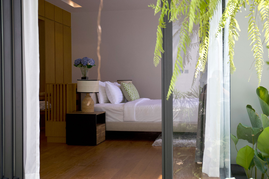 Set on a generous 333 sqm plot, the villa features three spacious bedrooms, each with a private bathroom and sliding glass doors that open directly to the garden or pool. The master suite enjoys two sides of garden access and app-controlled lighting. The sleek, open-plan living area flows to an outdoor sunken lounge, private swimming pool, and a covered sala—perfect for sunset drinks or casual gatherings.