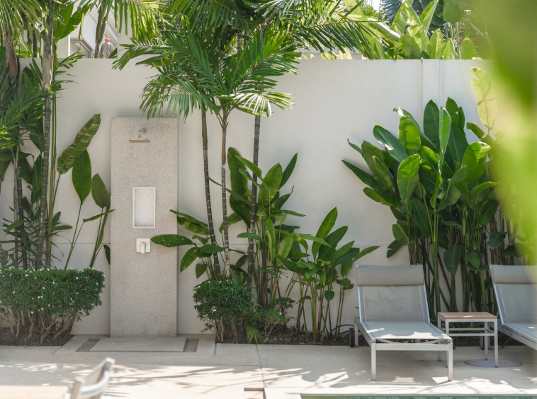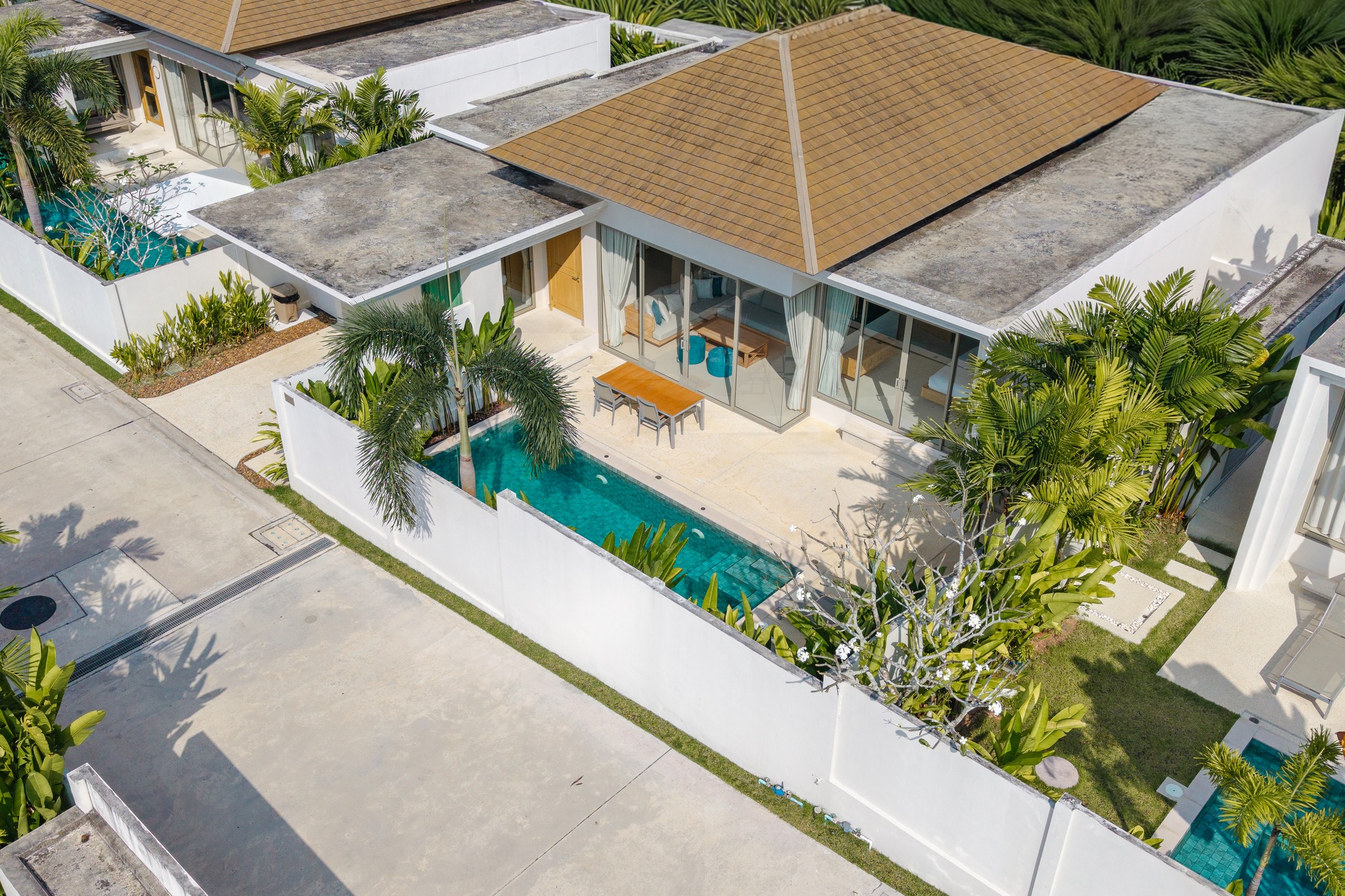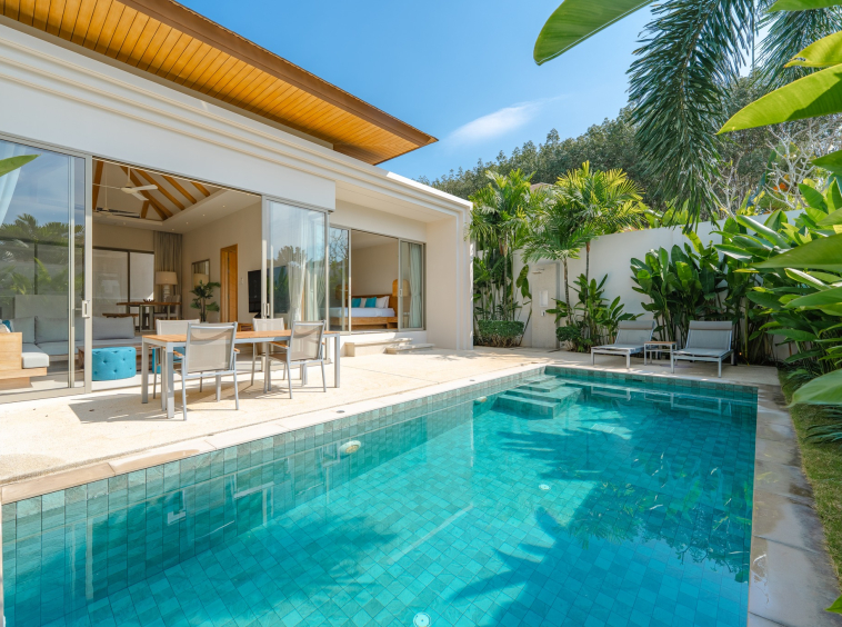 Outside, a private swimming pool is framed by a tropical garden, creating a calm space to unwind after work or enjoy the weekends. The outdoor patio with seating and sun loungers adds another layer of comfort, perfect for relaxed evenings in Phuket’s warm climate.